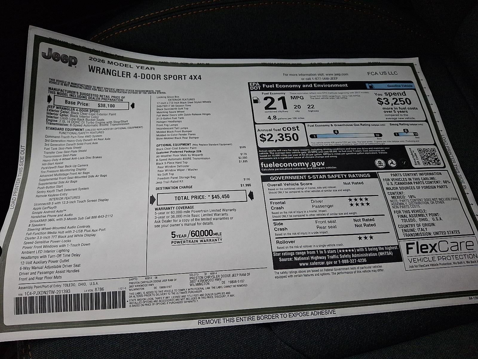 2.0L I4 DOHC DI TURBO ENGINE W/ESS, 8-SPEED AUTOMATIC 850RE TRANSMISSION, QUICK ORDER PACKAGE 22B SPORT, BLACK CLEARCOAT, BLACK, CLOTH LOW-BACK BUCKET SEATS, BLACK 3-PIECE HARD TOP, JEEP TRAIL RATED KIT, MOPAR ALL-WEATHER FLOOR MATS