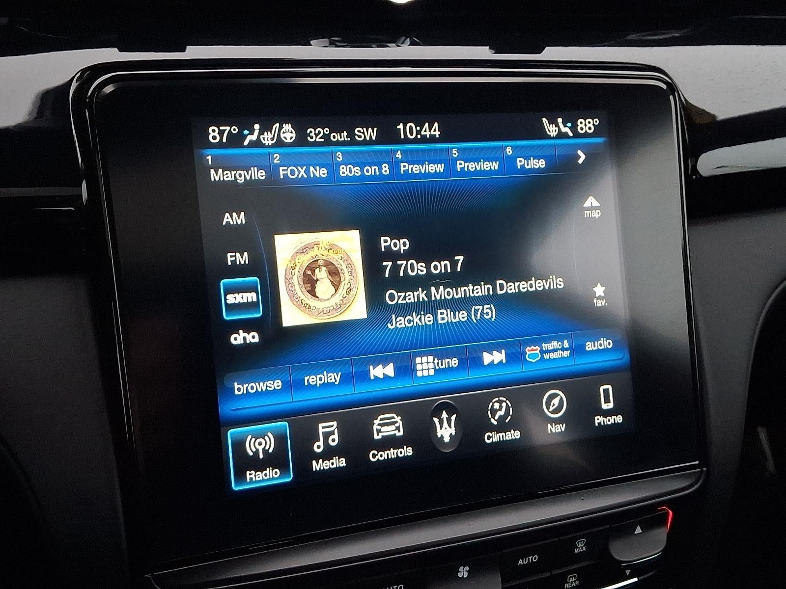 - Radio: AM/FM w/Maserati Touch Control Plus & Nav -inc: 8.4" touch screen display, HD Radio, SiriusXM satellite radio (1-year trial subscription), audio/video player, SD card reader, USB, aux-in, Aha radio, Apple Carplay and Android Auto capable, Bluetooth® function for audio streaming, climate controls, phone devices, Pandora internet radio, Siri personal assistant, SiriusXM Travel Link and Traffic (5-year trial subscription) and harman/kardon premium audio system (900 watts and 10 speakers w/subwoofer)