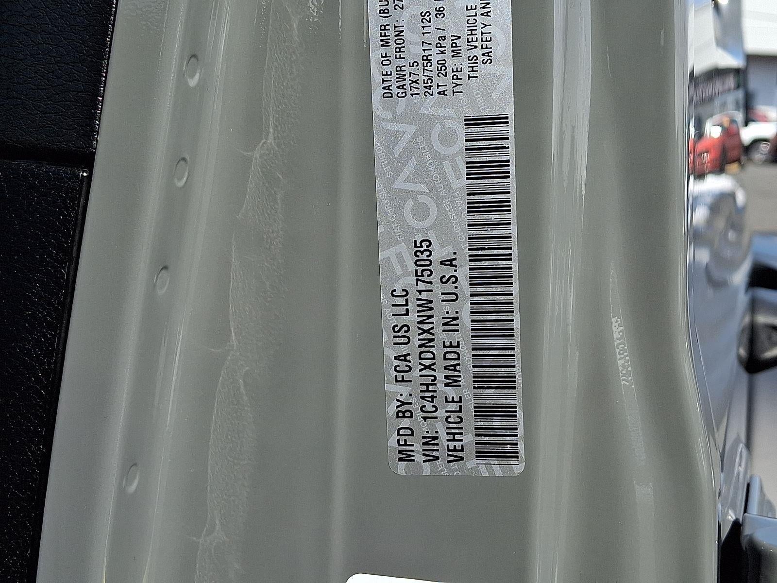 ENGINE: 2.0L I4 DOHC DI TURBO W/ESS, TRANSMISSION: 8-SPEED AUTOMATIC (850RE), QUICK ORDER PACKAGE 22S SPORT S, 3.45 REAR AXLE RATIO, WHEELS: 17"" X 7.5"" TECH SILVER ALUMINUM, TIRES: 245/75R17 ALL SEASON, BLACK, CLOTH LOW-BACK BUCKET SEATS, GVWR: 5,400 LBS, CONVENIENCE GROUP, TECHNOLOGY GROUP, COLD WEATHER GROUP, PREMIUM BLACK SUNRIDER SOFT TOP, SIDE STEPS, MANUFACTURER'S STATEMENT OF ORIGIN, SIRIUSXM SATELLITE RADIO, 2-DOOR PASSIVE ENTRY, FRONT DOOR LOCKS, MOPAR ALL-WEATHER FLOOR MATS